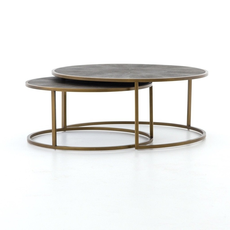Antique brass-finished iron curves like a crescent to welcome a nesting option for its smaller-scaled companion table. A resin faux shagreen table top in grey lends rich texture to clean, modern lines.