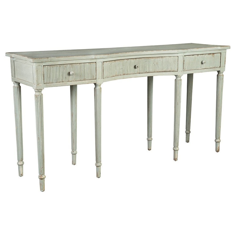 Experience sophistication with the Shapiro Console Table, meticulously created from solid mahogany. This elegant console showcases a serpentine top paired with turned legs and shaped drawers, all enhanced by hand-carved fluting. The distressed, aged finish in a surreal cloud blue adds a whimsical touch to any room decor. This table is delivered as a “flat-pack” for stress-free transport and simple assembly; just screw on the legs for an instant and significant aesthetic upgrade to your home.