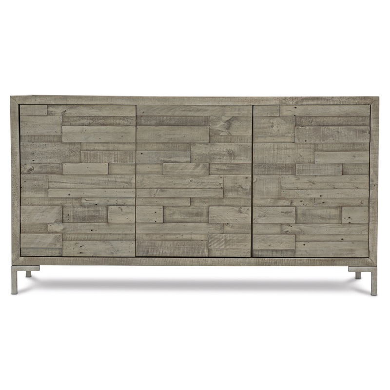 The Highland Park collection blends the best features of mid-century and farmhouse design, delivering an eclectic appeal with a laid-back vibe. The Shaw buffet adds layers of rustic texture to a clean, modern form. Reclaimed pine planks of varying lengths and widths create dimension and lend the feeling of a found object. The distressed pine is finished in a muted grey Morel, highlighting the grain and imperfections in the wood.