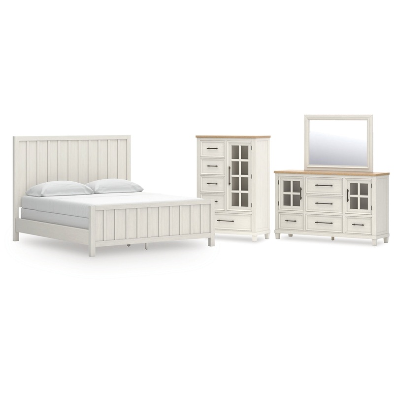 This bedroom set elevates the art of modern farmhouse design. Its two-tone aesthetic blends antiqued white and light grayish brown for added charm. Framed drawer fronts and dark rustic bar pulls lend a country feel. Conveying a feeling of relaxed comfort, this set is sure to carry you away to a dreamy time and place.