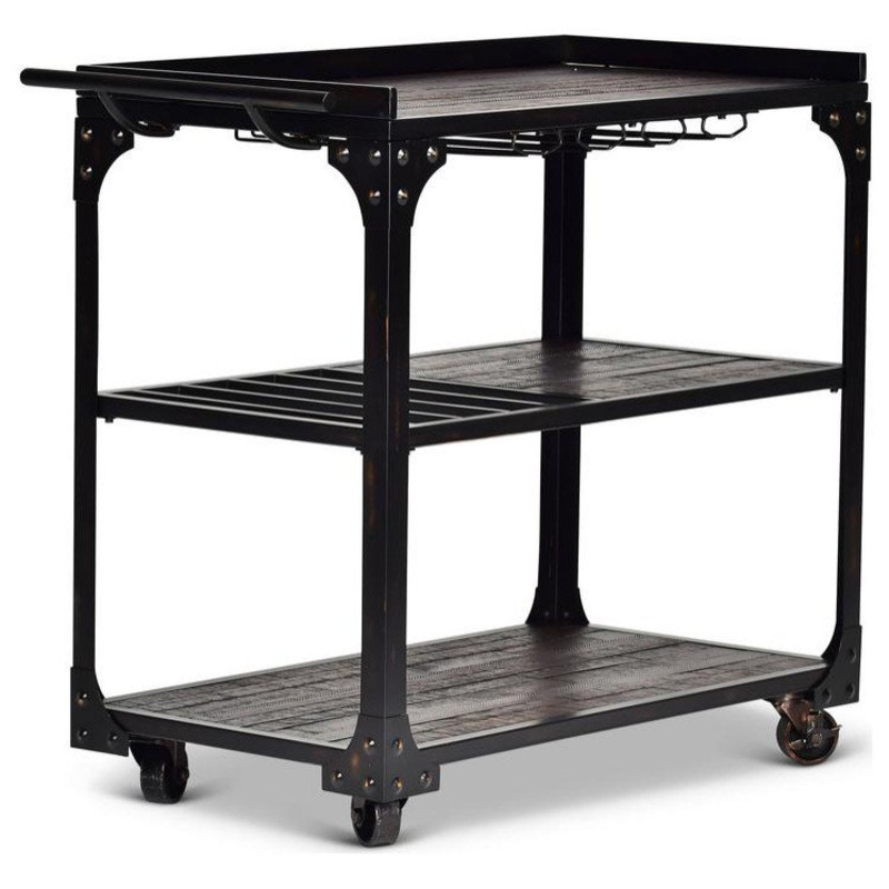 Mingling distressed, antique styling with industrial accents creates the stylish Sherlock Server Cart. Crafted from heavily distressed hardwood solids in a rustic tobacco finish and accented by a black iron frame with rub through. Metal riveting and lockin