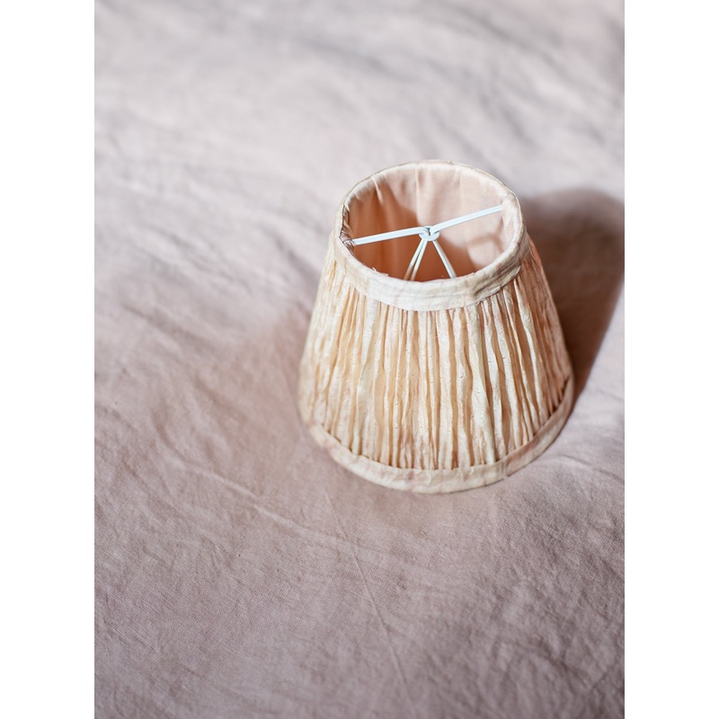 - A small, gathered handmade silk lampshade- Woven from beautifully textured raw Tussar silk- Pale pink silk lining- Dyed using the shibori technique of folding, bunching and binding cloth- For delicately diffused golden lighting