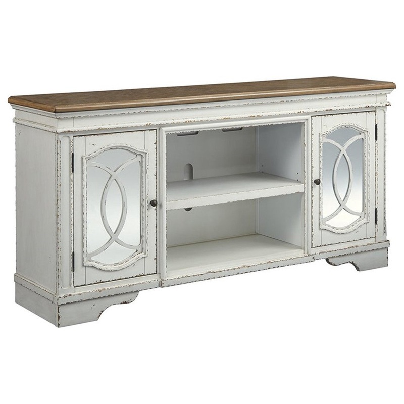 Elevating the art of traditional cottage styling, the Realyn TV stand with fireplace option is beautifully in tune with your taste. Antique two-tone aesthetic blends a chipped white with a distressed wood tone top for added charm. Cabinet doors decorative fretwork over mirrored glass adds a lovely twist. Compatible with W100-21 fireplace insert (sold separately).
