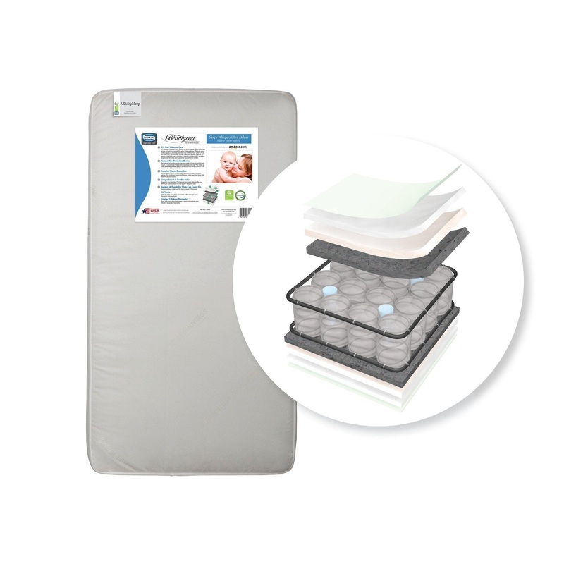 The Beautyrest Beginnings Sleepy Whispers Ultra Deluxe 2-in-1 Crib and Toddler Mattress from Simmons Kids is made with your little one's comfort and safety in mind. Featuring a dual-purpose design that provides the ideal firmness for newborns and a layer o