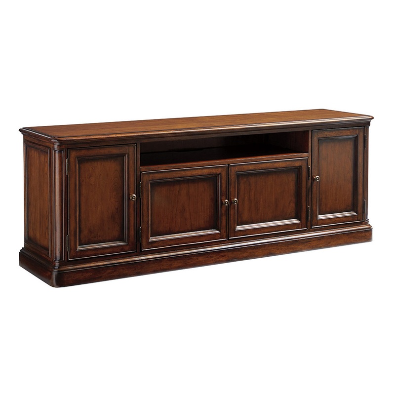 -Cord management Sligh Richmond Hill Waycroft Media Center in Warm Chestnut Brown 01-0305-661Traditional designs and media function pair well together with an open compartment (41W x 5H) making room for a sound bar, and two doors below with an adjustable shelf for components. The right and left doors open to two adjustable shelves with grommets for wire management and ventilation to provide air circulation for the electronics. For an additional charge, consider adding the Sligh StrongArm as your TV mount, with pivotal options to avoid direct sunlight and attractive wire management, all while keeping your surface clear.