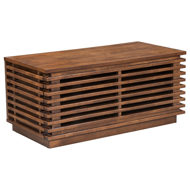 Scandinavian in design this series features narrow slim strips of solid wood, creating a modern open design and finished in a rich walnut finish. This tv console table features a front opening door with adjustable shelf and wire management holes in the rear.