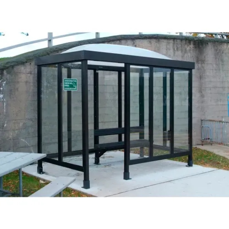 Smokers shelters provide a designated smoking area outdoors while protecting smokers from extreme weather conditions. These outdoor shelters can also be used as convenient bus stops providing an extruded aluminum bench and backrest along the rear wall to offer a comfortable sitting area for everyone. Smoking shelter huts help reduce OSHA fines and reduce insurance premiums. The framing system of these smoking shelters is built with industrial grade standards to withstand years of outdoor use. Smoker shelters are made with dark bronze anodized aluminum finish. Dome roof is made with 1/4″ thick white translucent acrylic that is break resistant. Glass panels are made with clear 1/4″ thick tempered safety glass. Outdoor bus stop shelters are pre-fabricated in sections for easy assembly and crated for low cost shipping. ADA compatible.