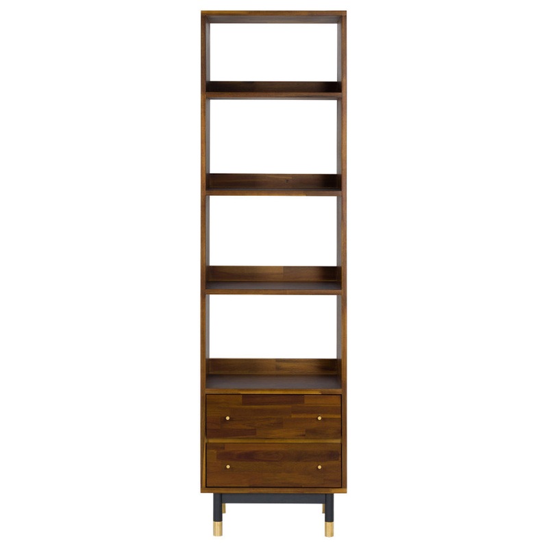 A thinner version of the soho bookcase provides the same sturdy, modern feel for people who are a bit more space conscious. This version, complete with two drawers at the bottom, maximizes space utilization without sacrificing style. The natural wood paired perfectly with the black powder-coated iron with gold legs make this a perfect accent to any room.