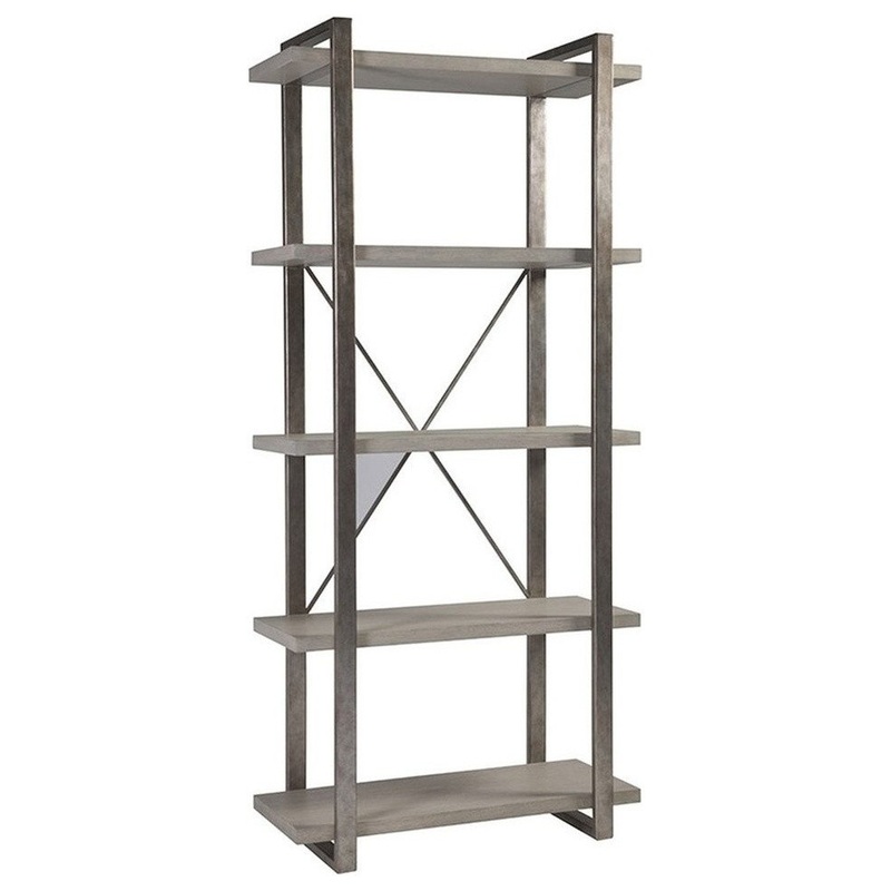 Metal base with X stretcher in the back in an antiqued silver leaf finish, and five wooden shelves in quartered white oak in a wire brushed light gray finish. Model # (MPN)2128-990Product ID160855623Manufactured ByArtistica HomeSold ByHouzzSize/WeightW 40"