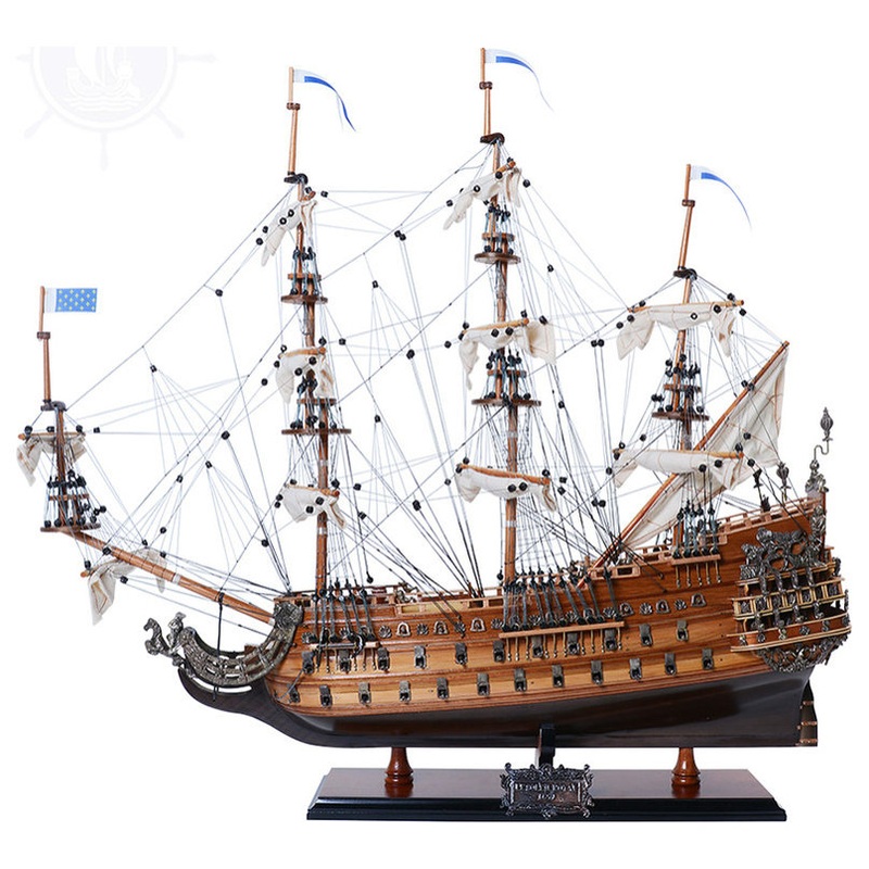 -About the Soleil Royal model shipThis is a museum-quality Soleil Royal model, FULLY ASSEMBLED replica of the most impressive tall ship ever in the French Navy. Built for King Louis XIV in the late 1600s, the 112-gunSun Kingwas decorated with woodcarvings of the French monarch and was the symbol of grace and ability. This is anExclusive Editionwhere the model has a unique serial number etched into the hull, which allows us to identify production date, material used and all other production information of a model. Master craftsmen using historical photographs, drawings or original plans meticulously handcraft these highly detailed wood models from scratch. They are built to scale with high-grade wood such as: western red cedar, rosewood, and mahogany. They are 100% hand built individually using plank-on-frame construction method and are similar to the building of actual ships. Each model requires hundreds of hours to finish and must go through a demanding quality control process before leaving the workshop. This beautiful Soleil Royal model features plank on frame, three decks, and two rows of ferocious cannons on each side of the ship. A unique bowsprit design that consists of: brass statues, crafted metal panels, and open metal doors that lead into the ship cabin. The front bowsprit and three large masts are connected securely using advanced rigging and lines painstakingly knotted and fastened by hand. Each yard has an attached hand-stitched rolled-up sails made of fine linen. Metal anchors and a wooden rudder are visible on the front and rear of the ship. On the deck, there are metal steering wheel, authentic hand-built lifeboats with ribs and planks, wooden ladders, wooden barrels, wooden windlass, and many other handcrafted ornaments. There is also an exquisite detailed admiral’s quarter on the stern with beautiful handcrafted metal lanterns, amazing metal crafted statues, and many detailed brass ornaments. This model comes standard with a solid wood base and brass nameplate. It’ll make a perfect gift for home or office decorator, boat enthusiast or passionate collector.