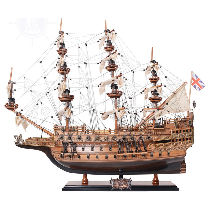 -About the Sovereign Of The Seas model shipThis is museum-quality, FULLY ASSEMBLED replica of H.M.S. Sovereign of the Seas, a first-rate ship in the British Royal Navy for more than 50 years in the 1600s. This is anExclusive Editionwhere the model has a unique serial number etched into the hull, which allows us to identify production date, material used and all other production information of a model. Master craftsmen using historical photographs, drawings or original plans meticulously handcraft these highly detailed wood models from scratch. They are built to scale with high-grade wood such as: western red cedar, rosewood, and mahogany. They are 100% hand built individually using plank-on-frame construction method and are similar to the building of actual ships. Each model requires hundreds of hours to finish and must go through a demanding quality control process before leaving the workshop. This magnificent Sovereign of the Seas model features plank on frame, three decks, and three rows of ferocious cannons on each side of the ship. A unique bowsprit design that consists of: brass statues and crafted brass ornaments on the panels. The front bowsprit and three large masts are connected securely using advanced rigging and lines painstakingly knotted and fastened by hand. Each yard has an attached hand-stitched rolled-up sails made of fine linen. Metal anchors and a wooden rudder are visible on the front and rear of the ship. On the deck, there are metal stationed cannons, authentic hand-built lifeboats with ribs and planks, wooden cabin, and many other handcrafted ornaments. There is also an exquisite detailed admiral’s quarter on the stern with a beautiful handcrafted metal lantern, amazing metal crafted statues, and many other spectacular brass ornaments. This model comes standard with a solid wood base and brass nameplate. It’ll make a perfect gift for home or office decorator, boat enthusiast or passionate collector.