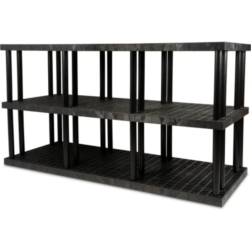 Withstands extreme temperatures in wet or corrosive environments. High density, black structural plastic resin is ideal for freezers and impervious to oils, salts, acids and most chemicals. Open grid design reduces dust accumulation, increases air and light penetration and promotes drainage. Strong 2-5/8″ thick shelves and 2-3/8″ diameter posts interlock together to form a rigid assembly. Stationary Shelf Unit has 25″ clearance between posts and 20″ between shelves. Virtually maintenance free. Steam cleanable. Quick and easy assembly, no tools required.