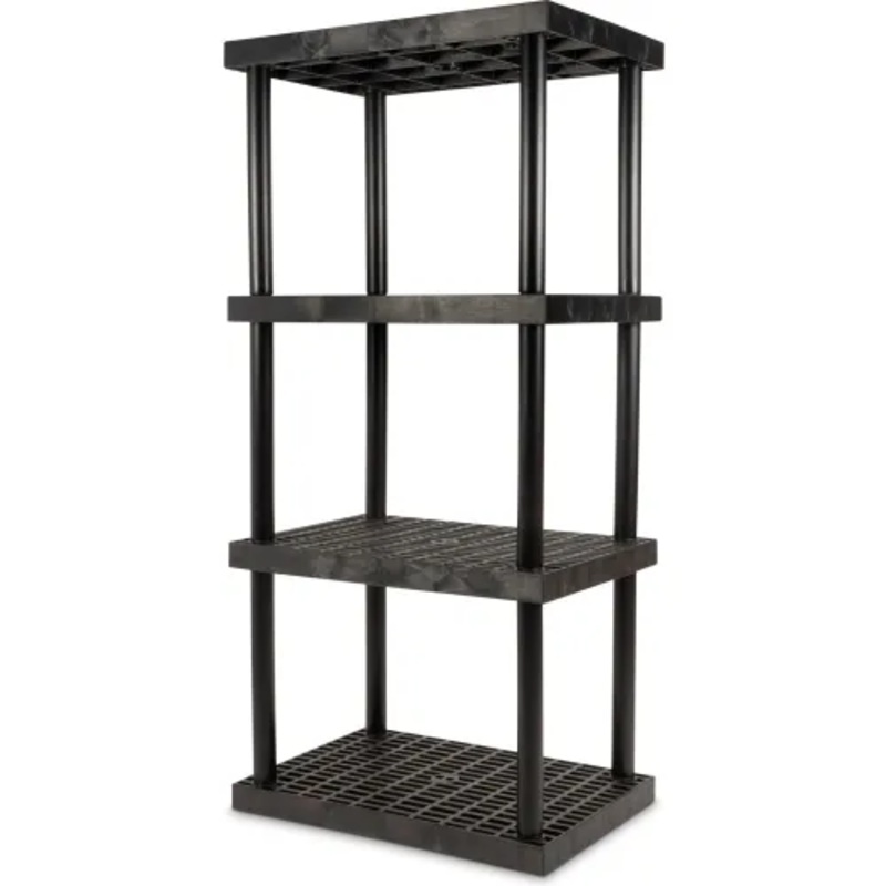 Withstands extreme temperatures in wet or corrosive environments. High density, black structural plastic resin is ideal for freezers and impervious to oils, salts, acids and most chemicals. Open grid design reduces dust accumulation, increases air and light penetration and promotes drainage. Strong 2-5/8″ thick shelves and 2-3/8″ diameter posts interlock together to form a rigid assembly. Stationary Shelf Unit has 25″ clearance between posts and 20″ between shelves. Virtually maintenance free. Steam cleanable. Quick and easy assembly, no tools required.