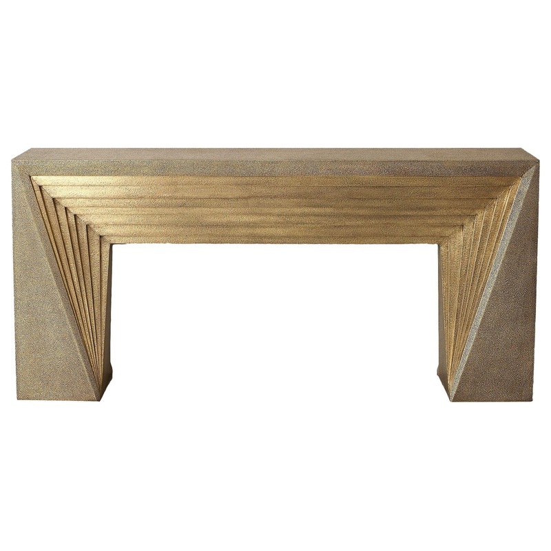 The Deco Console is handcrafted in hardwood with hand-applied and hand textured brass sheeting finished with antique wash.
