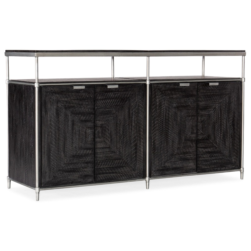 Authentic with an artistic character, the St. Armand Entertainment Console is crafted of Acacia Solid Wood in a distressed black finish with brushed pewter metal trim. Featuring 4 doors with soft-close hinges and one adjustable shelf behind each pair of do