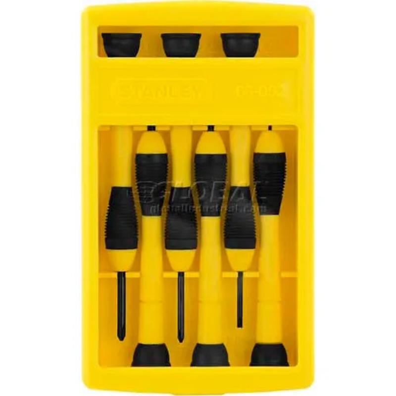 Stanley 66-052, 6 Piece Precision Screwdriver SetSwivel-head handles provide precision and reach. Tough, plastic handles with soft cushion grip for comfort. Finish on bars for corrosion resistance. Plastic storage case included.INCLUDES:1.4, 2.0, 2.4, 3.0