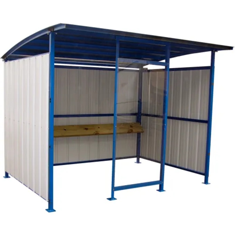 Steel storage buildings are available in varying styles for multiple applications. These outdoor storage shelters provide storage space for equipment, supplies, bikes and more. Sheds are made of durable steel for maximum protection and strength. 18-gauge steel roof is contoured for water drainage. 28-gauge steel siding for added protection. Welded steel frame is powder-coated blue. Includes lag-down plates for secure installation. Shed measures 10 ft wide x 8 ft deep x 9 ft high overall. Steel Smokers Shelter includes a 42″W clear front panel to protect people from wind and the elements. Provides a convenient smokers shelter or bus stop. Includes a wooden lean-back bend rail for user comfort. Easy assembly.