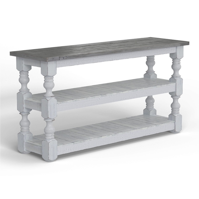 Sofa Table. Exuding farmhouse chic with just the right touch of old-world charm, the Stone Collection is meticulously crafted from solid pine wood. The wood is lightly distressed, showcasing a white finish and complemented by weathered gray tops.
