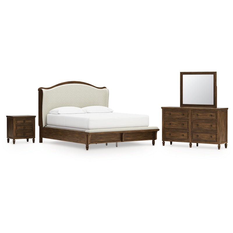 Sturlayne California King Upholstered Panel Bed with Mirrored Dresser and Nightstand