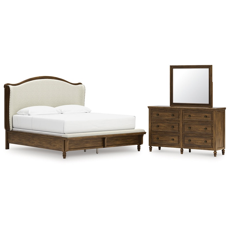 Sturlayne King Upholstered Panel Bed with Mirrored Dresser