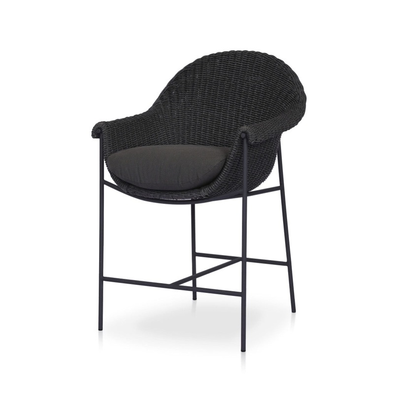 With a curvy silhouette and classic rolled arms, a woven frame brings modern sensibility to this vintage-inspired outdoor counter stool, with an airy iron cradle base for a beautiful balance of scale. Paired with a fully upholstered cushion for a comfortab