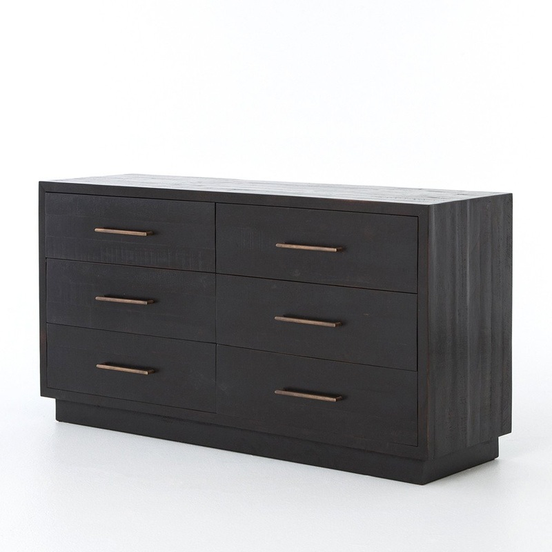 Simple sophistication with a modern edge. Solid acacia forms clean lines to lighten the natural depth of a burnished black finish. Brass-finished hardware adds a sleek touch to six spacious drawers.