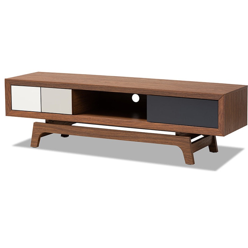 Give your space a dose of retro flair with the Svante TV stand. Constructed from solid MDF wood in a walnut finish, the Svante is built to be a fixture in your living room for years to come. One open shelf provides space to store DVD players, game consoles, and more. A circular cut-out behind the shelf enables easy concealment of cables and wires. Additional storage space is provided by three drawers, which feature grey and white drawer fronts that display a cool gradient effect. Each drawer is fitted with push buttons for ease in opening. Inspired by mid-century modern design, the Svante features angled legs. The Svante TV stand is made in Malaysia and requires assembly.