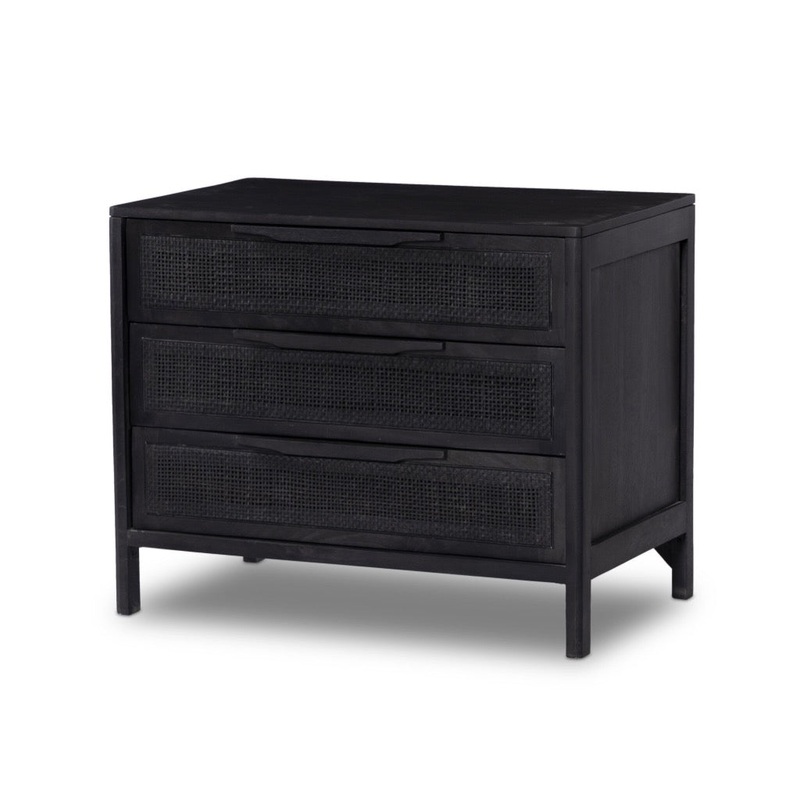Solid, black-finished mango encases inset woven black cane, for a textural take on bedside storage.