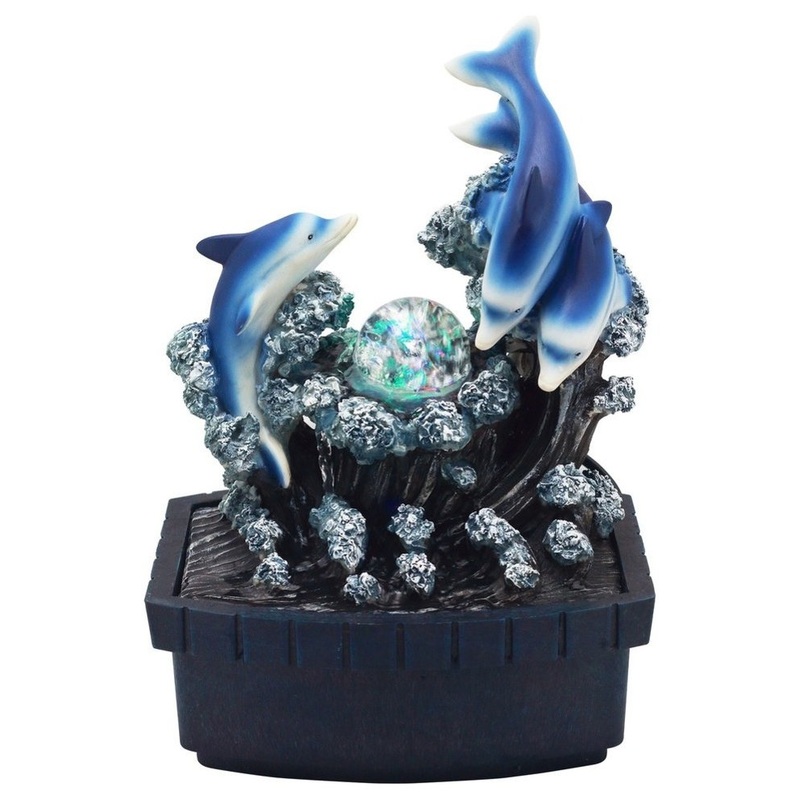 This lovely table fountain features three playful dolphins swimming together in the splashing sea waves. Creates a soft and soothing sensation. The crystal-like ball rotates and reflects the color-changing LED light. Water cascades from and down the ball. Made of polyresin.