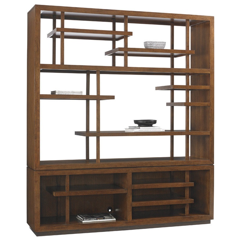 Configurable asymmetrical horizontal and vertical partitions make a grand statement without compromising function. The Pan-Asian styling consists of two main sections. The upper section consists of six stationary shelves and two removable shelves and posts. The lower section has three stationary shelves and grommets for electrical cords. A TV compartment can be created measuring 57.25 inches wide and 37.87 inches high.