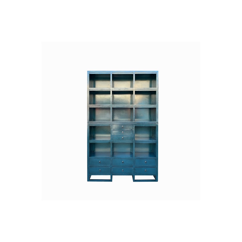This bookcase or display cabinet is made of elm wood with a solid bold blue #28627e lacquer finish. It is a combination of two pieces. There are open sections for display collections and small rectangular-shaped drawers for accessories storage. -Dimensions
