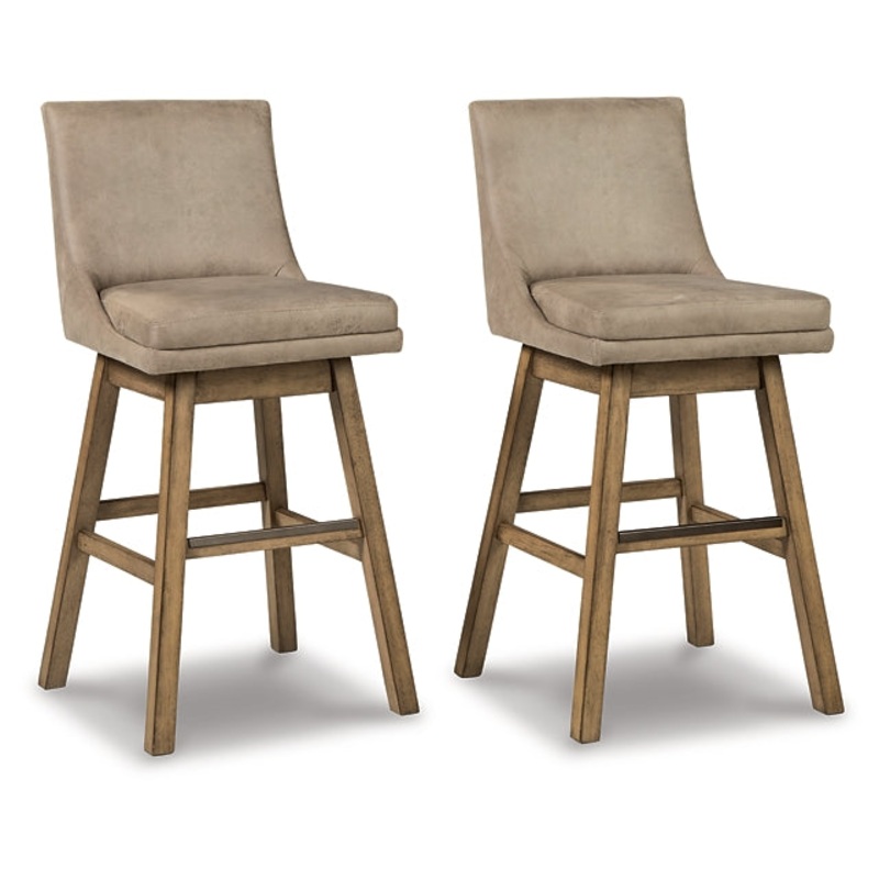 This striking barstool set invites you to take contemporary modern style for a spin. Comfortably cushioned seat, self-returning swivel and contoured back make it beautifully in tune with your needs. Luxurious faux leather upholstery is a sensational touch.