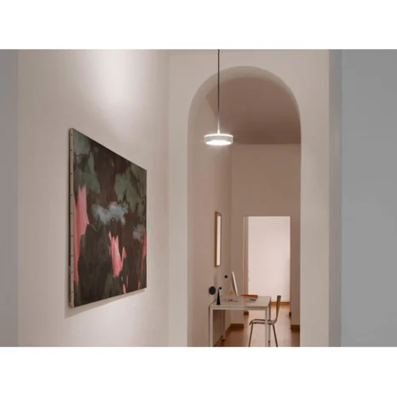 Tamb is an elegant hanging lamp designed by Carlo Guglielmi. The peculiarity lies in the shape of its diffuser, which resembles a tambourine, from which it is inspired. Its light beam is characterized by two LED boards placed inside it that allow three modes of lighting: Direct, indirect or combined simultaneously, so you can adjust the light to your liking. Tamb goes well with any type of furnishing style and is particularly suitable for modern and contemporary settings.