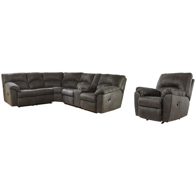 With plush cushions and wraparound pillow top arms, this 2-piece sectional and recliner set takes comfort to a whole new level. Faux vintage leather requires minimal care, making this relaxation station ideal in homes with children and pets. Reclining feat