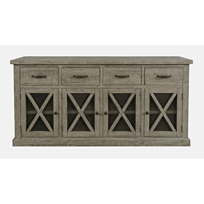 The Telluride Collection is the epitome of rustic style with its mixed media durable construction. The natural pine, with its subtle distressing, make this a bold statement piece on its own or a perfect added accent to your interior. This sideboard features four drawers and four doors with black wire grill detail and fixed interior shelves.