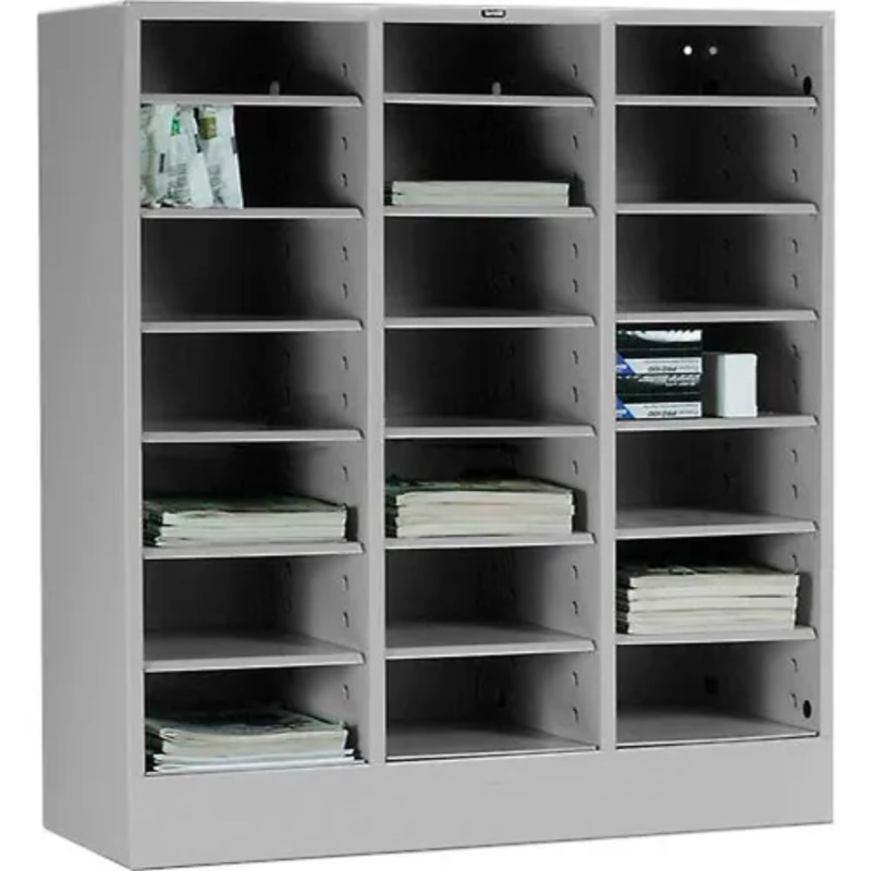 Custom build an office storage, literature or document center that’s built to last for years of reliable service. This heavy gauge all welded office furniture provides open, at-a-glance storage so you can custom build the office storage system you need. This Literature Organizer has 21 compartments that adjust at 1-1/2″ increments to accommodate paper forms, catalogs, parts and supplies. Can be stacked vertically or ganged side-by-side in combinations with our 30 Drawer Cabinet. Shipped assembled. All Tennsco products are Proudly Made in the USA.