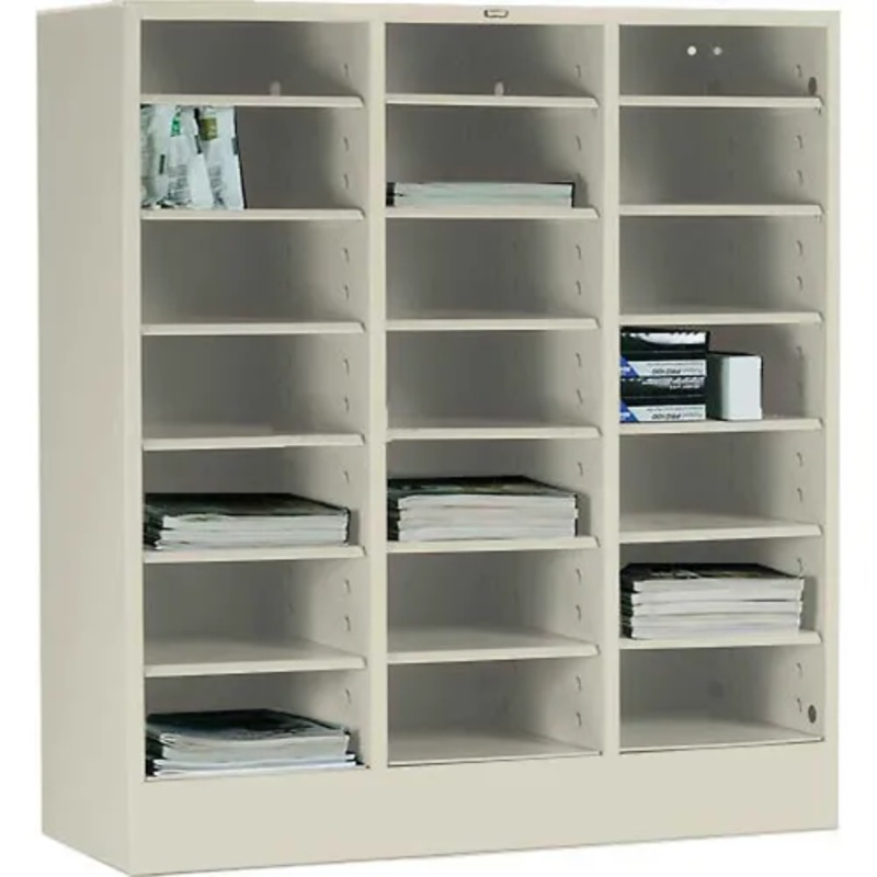 Custom build an office storage, literature or document center that’s built to last for years of reliable service. This heavy gauge all welded office furniture provides open, at-a-glance storage so you can custom build the office storage system you need. This Literature Organizer has 21 compartments that adjust at 1-1/2″ increments to accommodate paper forms, catalogs, parts and supplies. Can be stacked vertically or ganged side-by-side in combinations with our 30 Drawer Cabinet.. Shipped assembled. All Tennsco products are Proudly Made in the USA.