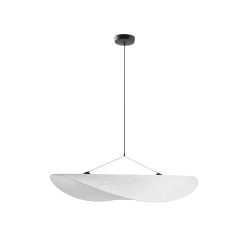 Tense is a suspension lamp with a simple and essential design, used to create a lighting that illuminates focusing on a specific area, like a dining table or a desk. The structure is in Tyvek (a resistant material able to create soft and enveloping cloud-like shapes), that New Works handles carefully to highlight its features in all its naturalness.
