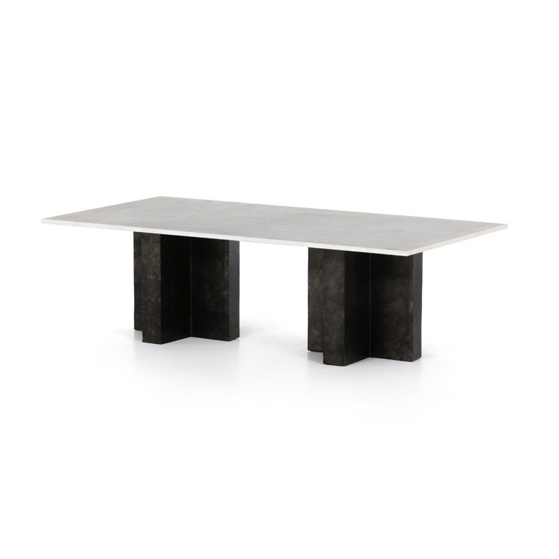 Classic with contrast. Finished in a raw black, uniquely angular cast aluminum legs support a rectangular tabletop of solid marble in a clean, polished white.