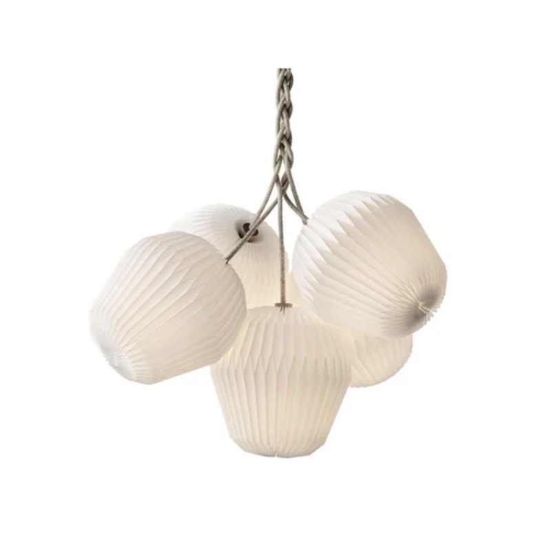 The Le Klint brand, true to its concept of tradition and innovation, offers this charming suspension lamp that will add a touch of class and sophistication to any interior. The Bouquet XL 5 is composed of a weave of linen-covered threads, which support the splendid composition of 5 lamps with a white pleated diffuser, recalling the Nordic style. The light sources exploiting the materials and lines of the same, will project a delicate and homogeneous beam of light capable of enhancing the interiors of rooms such as dining rooms, corridors and hospitality, which will benefit in terms of elegance.