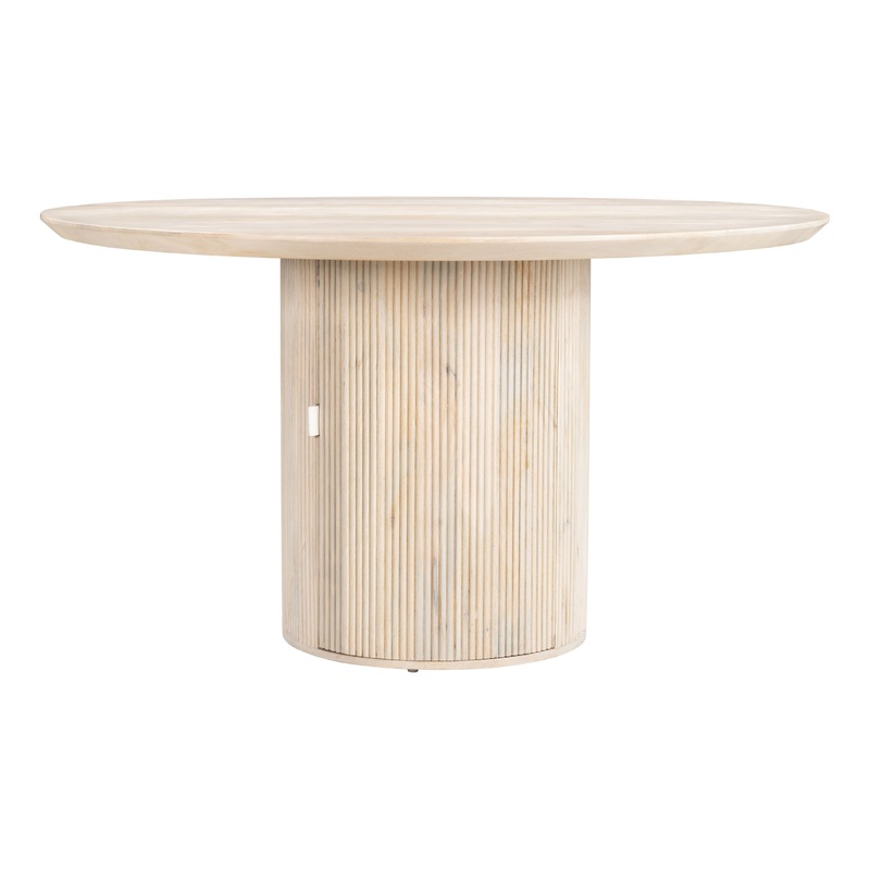 The Izola Dining Table is a beautiful and functional piece of furniture that would make a great addition to any modern dining room. It is made from brown stained mango wood, which provides a warm and inviting feeling to the space. The table features a unique storage compartment inside the base, which is perfect for storing dinnerware or other items. This feature makes it an excellent choice for smaller spaces, such as apartments or condos, where storage can be at a premium.