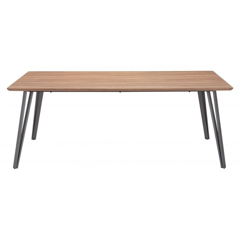 The Perpignan Table is a versatile multifunction piece that looks good in any room, dining, workspace, or loft. It has mid century, industrial, and urban design elements. The top is made of MDF with a walnut colored laminate and steel legs powder coated in black.