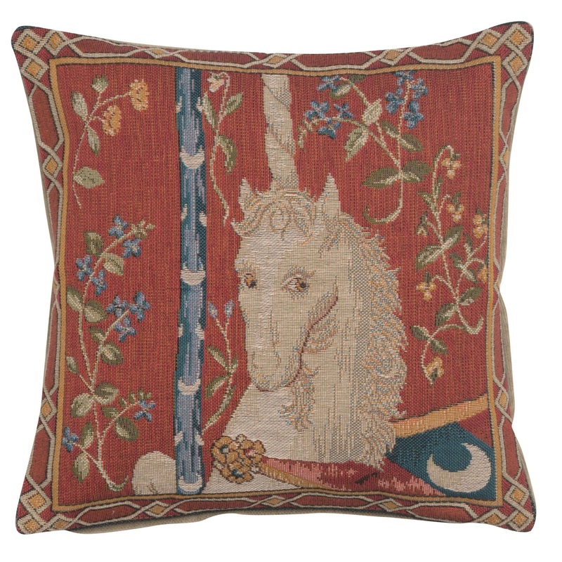 This imported jacquard cushion cover represents the unicorn from the famous work “the Lady and the Unicorn”.