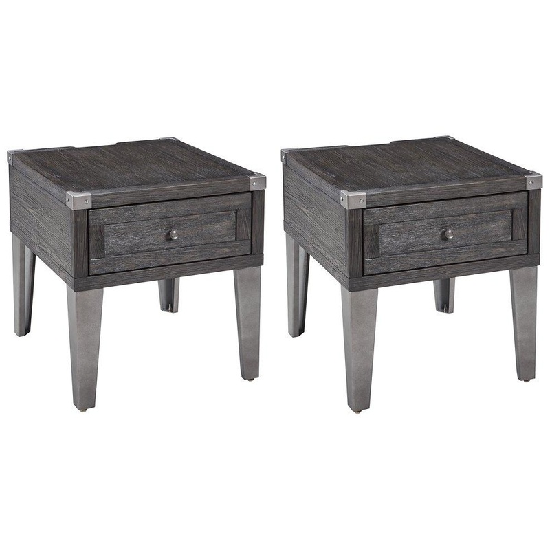 Take a stance for rustic-industrial style with this 2-piece end table set. Weather-washed pine wood and veneers are contrasted with canted metal legs and corner bracket accents for a uniquely chic merger of earthy beauty and contemporary flair. Power plug-ins and USB charging ports mounted on the back add practical function to great form.
