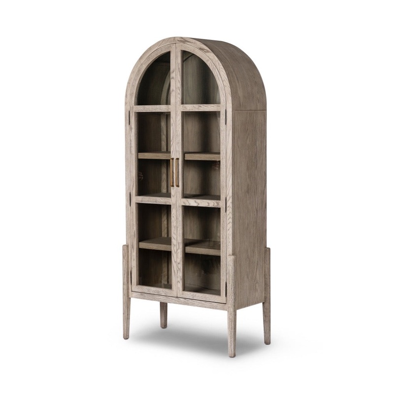 Store it in style. Beautifully shaped cabinetry of rustic white solid oak features spacious interior shelving and clear glass front, ready for displaying favorite books, photos and treasures.