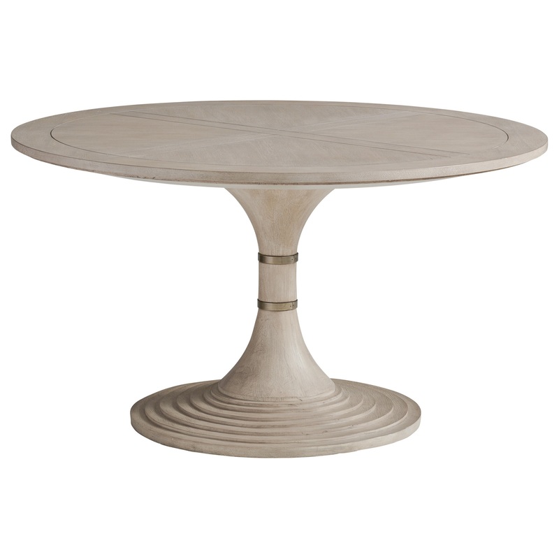 The 54-inch dining table features an elegant hour-glass design, with two decorative metal collars on the pedestal and a contemporary waterfall detail on the base. The silhouette is ideal for use as a center table, or intimate dining for four. The top features a bordered 4-way match of quartered hickory veneer.