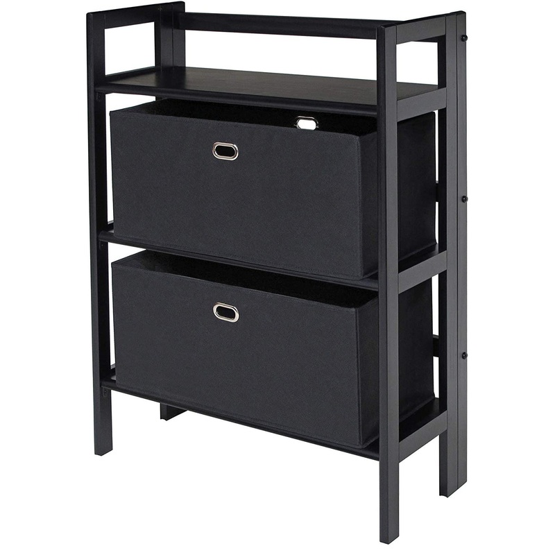 Combine extra storage space with the convenience of a folding shelf for a great organizational piece. Keep winter accessories handy in the front hall or use the unit to store toys, crafts, towels or sweaters. Two units can be stacked to provide additional vertical storage space. The 2-Tier Shelf is finished in Black and is made of Solid Wood for handsome and long-lasting durability. The foldable baskets are constructed of sturdy fiberboard with Black fabric. Carrying them is easy and secure with metal ring handles. This versatile shelf offers stylish organization for all your essentials.