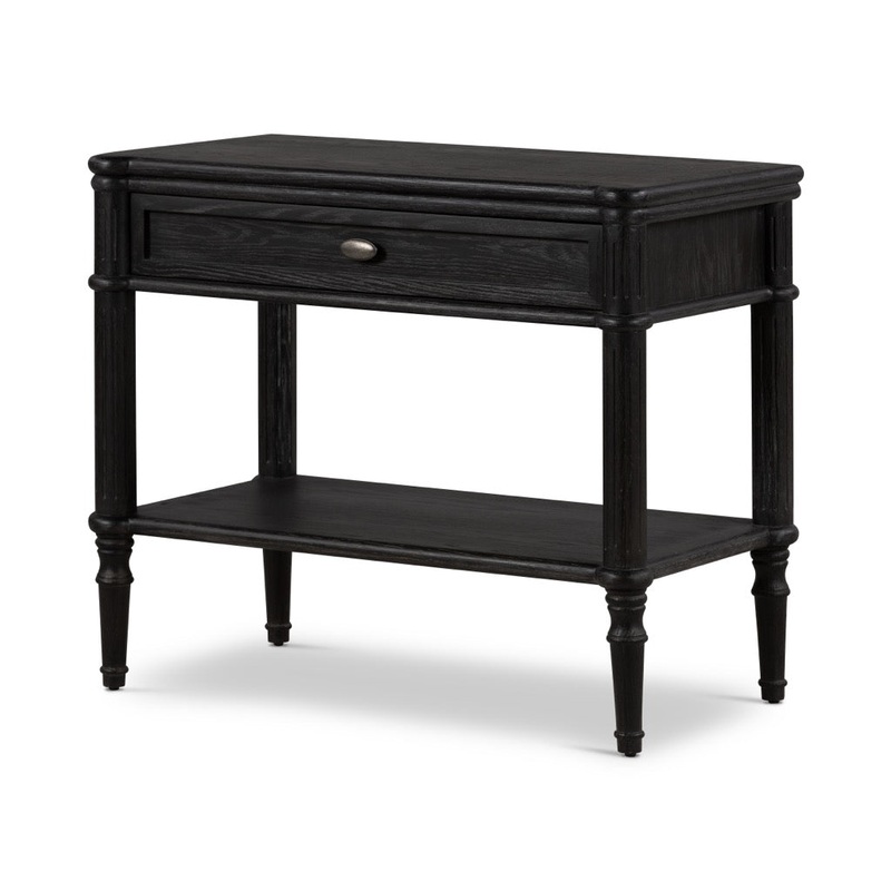 Influenced by vintage European lines, this inspired nightstand is traditionally styled with a spacious drawer and open shelf. Framed panels, rounded corners, and finished with an aged brass drawer pull and tapered spindle legs. Made from solid oak and veneers in distressed black for a classic look.