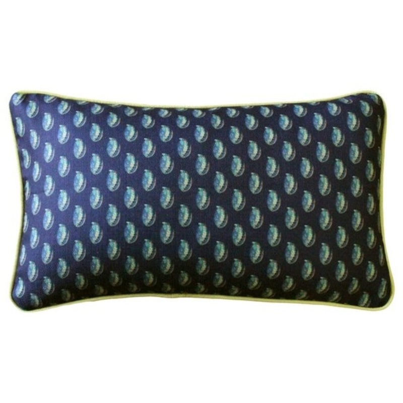 This 12×20 inch rectangular throw pillow features a repeating pattern of abalone shells. It is a perfect accent piece on it’s own, or can be layered in front of the larger square abalone pillows from the same Shoal Cape collection. The pillow is beautifully finished with chartreuse green piping. A Tracy Upton original design.
