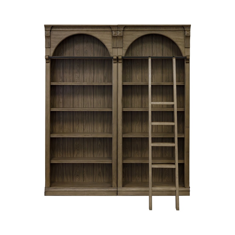 Stratton emulates the grand scale and timeless beauty of a gothic library. Distinguishing details include elegant arches, fluted corbels, dentil molding, and bead board back panels. Hardwood veneers have been wire brushed and intentionally distressed to present an authentic aged appearance and are enhanced by the rich toffee finish. The five step wooden ladder can be hung on metal bars for an added touch of nostalgia.